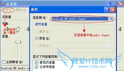 1、双击任务栏右侧声音图标,打开主音量调节,点“选项”选择“属性”菜单,在属性对话框的混音器中选择audio input,确定返回。