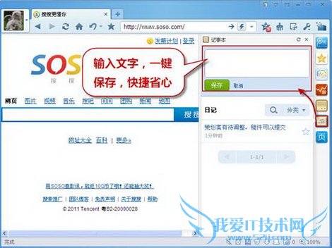 点击QQ浏览器侧边栏记事本功能,将复制下来的重要内容直接粘贴到框内,点击保存即可。此外,还可以利用记事本功能写当天的工作日记或备忘录,功能虽小,用处不小!(图3)