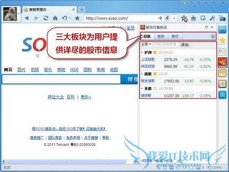 点击侧边栏“股市行情”按钮,“自选”页面为用户提供“沪深”、“港股”、“美股”的实时涨跌情况,还可添加其他股票代码查看,更可以进入腾讯 财经页面查看详细信息;“板块”页面为用户提供各行业股市涨跌前10和后10……智能的板块安排为喜欢炒股的用户提供独到、贴心的股市行情服务!(图6)