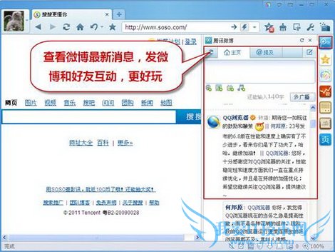 点击QQ浏览器界面上的侧边栏按钮,展开侧边栏,点击位于首位的微博图标,即可轻松浏览微博好友动态,轻松查看提到我的微博,还可直接发微博!和好友互动更便捷、更尽兴!(图4)