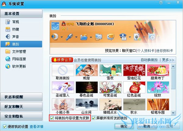 如果您是QQ会员,使用的是QQ2010SP3以上版本,还可以使用装扮功能设置更多漂亮的皮肤,如图: