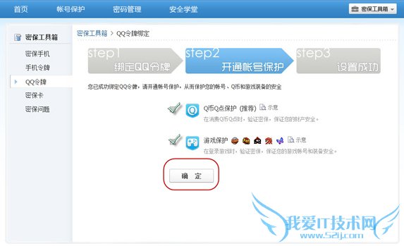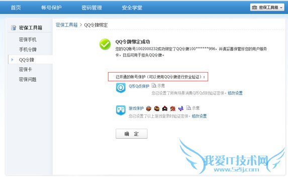 勾选您想要设置的帐号保护,点“确定”,则直接绑定QQ令牌并成功设置帐号保护,页面会显示如下: