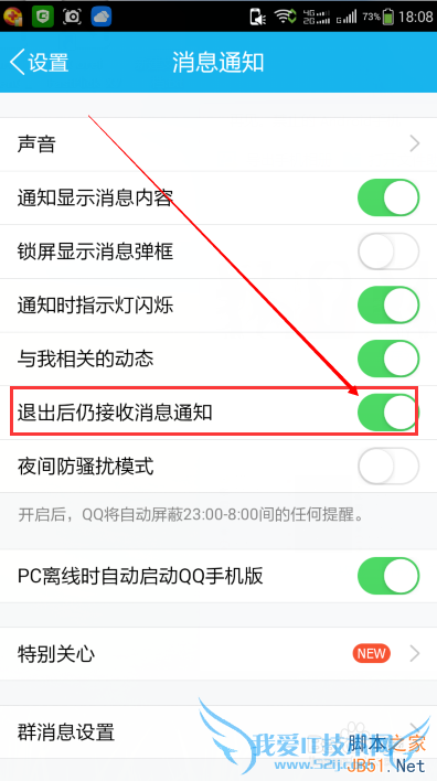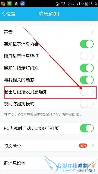 在消息通知界面里我们可以看到一个”退出后扔接收消息通知“的选项,该选项右边的按钮是打开状态,也就是按钮显示为绿色,表示手机退出QQ还是会接收到离线消息,然后在手机系统通知栏提示。我们点击该按钮把它关闭。