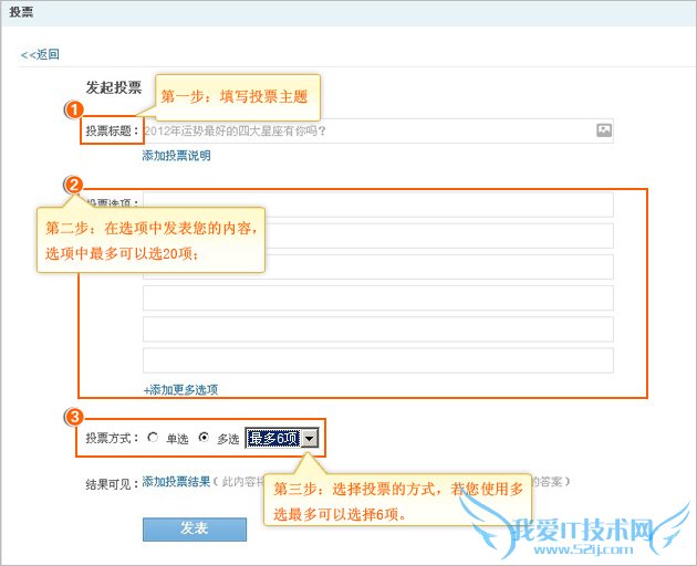 写出自己的投票主题,让大家对您的问题投票。可自定义多个选项让大家投票回答。(选项可选20项,投票方式可以多选,最多也可以投20项)