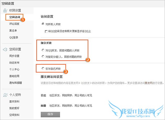 一、在访问设置中分为‘对所有人开放’、‘部分开放’、‘仅对自己开放’: