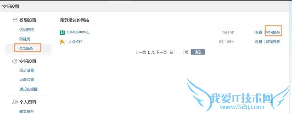 2、在侧边栏位置,我们选择“QQ登录”,在QQ登录这一栏中我们就能看到所有授权过的网站或者论坛,如果一些不是经常访问的网站或论坛,我们可以点击“取消授权”。这样就能更好地保护自己的QQ账号了。