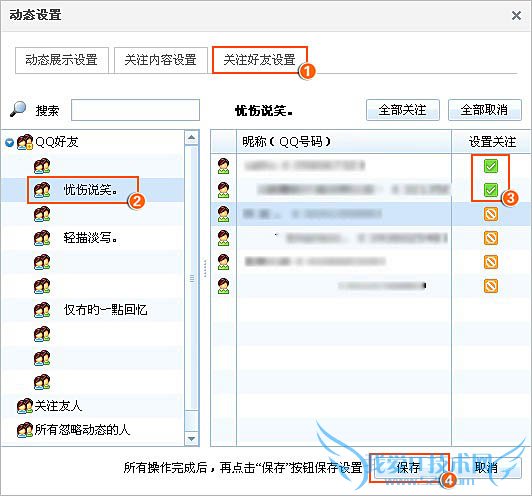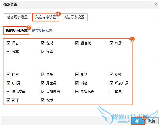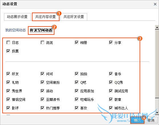 选择‘关注内容设置’,可以自定义选择您想关注好友空间的类别前打上勾,最后“确定”即可。
