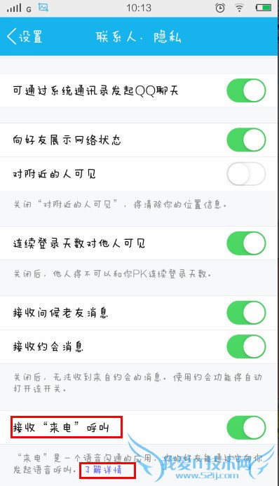 3、我们可以在最下方看见接受“来电”呼叫,我们将它打开,然后点击“了解详情”