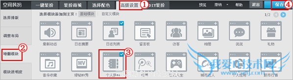 第二步:进入空间装扮页面后,点击“高级设置”=》“增删模块”=》把您想显示的模块方框里打勾,最后“保存”操作即可。