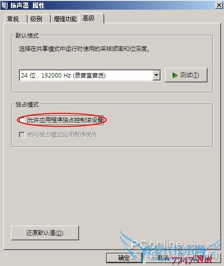 随后,系统将会弹出另一对话框,这时请切换至“高级”选项卡,然后取消勾选的“允许应用程序独占该设备”即可(图2)。