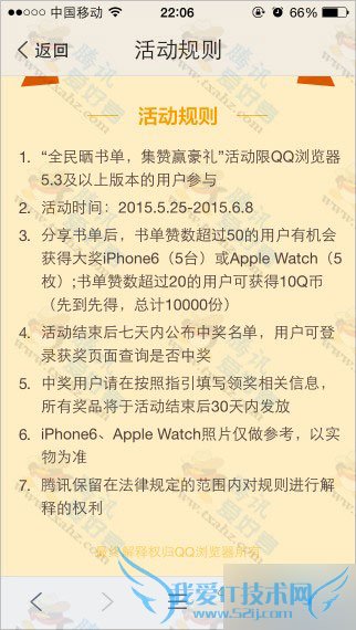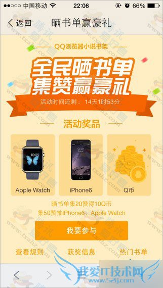 手机QQ浏览器 晒书单集赞赢好礼活动,晒书单集20赞得10Q币、集50赞抽iPhone6、Apple Watch。10Q币先到先得,总计10000份,活动限QQ浏览器5.3及以上版本的用户参与。今天刚开启的活动,脚本之家网站首发,所以现在撸的话10000名之内是完全没有问题滴!