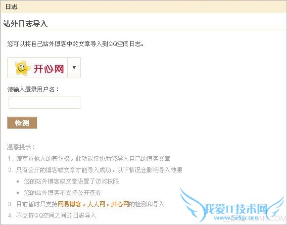 目前暂时只支持网易博客,人人网,开心网的检测和导入,但不支持QQ空间与QQ空间之间的互相导入。