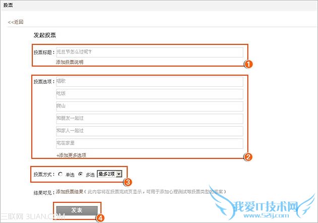 三、写出自己的投票主题,让大家对您的问题投票。可自定义多个选项让大家投票回答。(选项可选15项,投票方式可以多选,最多也可以投15项)