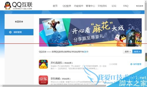 4、点击右上角的QQ网名,显示授权管理和退出两个选项,点击“授权管理”,进入下面的界面,这样就可以看到所有QQ授权过的网站和游戏应用,