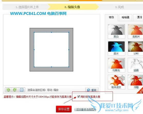4、点击上传之后,之后会进入头像编辑界面,如果是QQ会员要先把下面“同时保存高清头像”里面的勾去掉,不然头像是黑色的,不是会员则可以省略,直接点“保存设置”如下图: