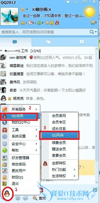 2、然后再QQ面板里面进入QQ风尚上传这种图片,方法是:点击QQ的主菜单,然后选择“QQ会员”,之后再选择“QQ风尚”进入即可: