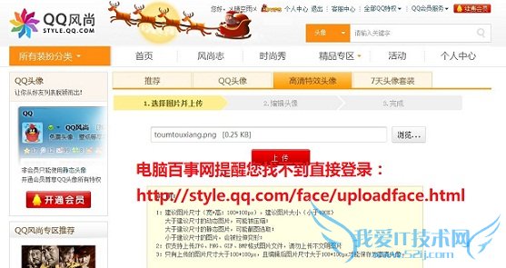 3、进入QQ风尚界面后,再找到“头像”类别,然后再选择“高清特效头像”。然后就能看到上传照片的按钮了,我们把刚刚保存或下载的QQ透明头像文件到上传如下图: