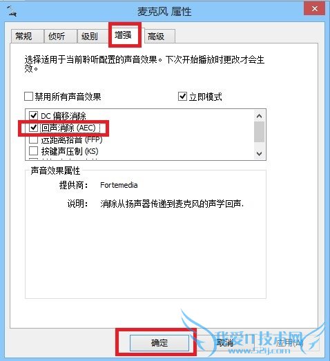 4. 选择“增强”打上“回声消除”前面的小勾,确定保存。
