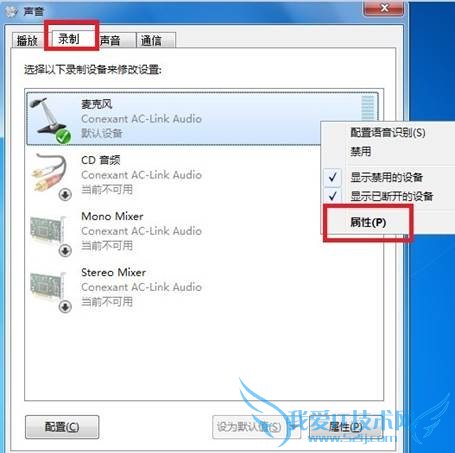 1. 在控制面板中打开“声音,点击录音或直接右击任务栏中的小喇叭选择录音设备;