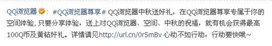 中国一年一度的传统佳节——中秋节即将到来,QQ浏览器为答谢用户长期以来的支持和厚爱,特在腾讯微博上举行发送祝福送好礼活动。在此期间,用户只要分享体验,送上对QQ浏览器、空间、中秋的祝福,就有机会获得最高100Q币及黄钻好礼!目前,该活动正火热进行中。