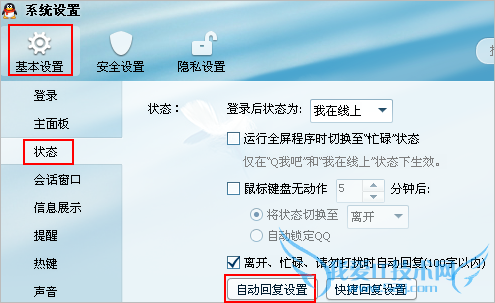 QQ2013版本:在QQ面板=》系统设置=》基本设置=》状态=》自动回复设置,即可根据您需求进行添加修改。