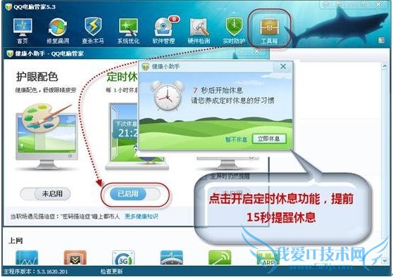 长期坐在电脑前一动不动的工作,对眼睛和脊椎有严重的伤害,工作效率也会降低。而据相关资料显示,工作1小时,休息两三分钟就会有奇效。利用 QQ电脑管家健康小助手“定时休息”功能,进入休息模式,揉揉眼睛伸伸懒腰,放松一下紧绷的神经,会有事半功倍的效果。在QQ电脑管家的“工具箱”中,点 击“健康小助手”设置启用“定时休息”功能,智能设置每小时休息三分钟,进入休息模式前会提前15秒会弹出提示框,方便用户及时保存当前工作。(图5)