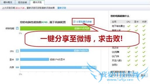 晒包包、晒签名、晒和老爸老妈的聊天记录?你OUT啦,现在最流行晒电脑配置!在这个分享为王,娱乐至上的年代,将电脑硬件评分分享到微博上也 成为一种潮流!QQ电脑管家新增硬件评测分享功能,可以将硬件评测结果一键分享至腾讯微博,用数字说话证明爱机的“实力”!在QQ电脑管家5.3 Beta1“硬件检测”中选择“硬件评测”可获取到电脑的详细评分参数和性能指数,点击“分享到腾讯微博”就能将评分结果分享给好友了!还不快试试?(图 4)