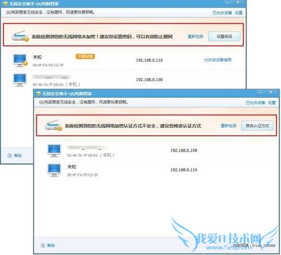 打开“工具箱”在上网栏开启“无线安全助手”,检测当前网络使用情况,检测完成后,界面上会显示出当前正在使用网络的设备信息,包括机器名、 MAC地址以及IP地址等,直观的显示可疑的设备,用户可以选择“允许该设备使用”或者干脆提醒设置加密,对于加密方式不安全仍具有安全隐患的情况,QQ 电脑管家则会提醒用户“修改认证方式”,并引导教育用户修改设置加密方式,拒绝被蹭网,让网速更快更顺畅!(图1)