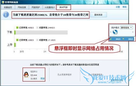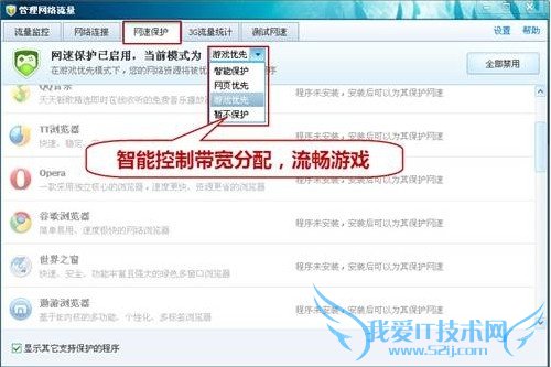 用户在QQ电脑管家主页的“工具箱”中选择“管理网络流量”功能,点击“网速保护”标签,并开启网速保护模式,在下拉框中选择“游戏优先”的模 式,就能够实现智能控制带宽分配,保证游戏进程流畅,同时分配多余流量到其他后台执行的项目;当然,用户也可以根据需要选择“智能保护”和“网页优先”的 模式来配合不同的操作进程。(图2)