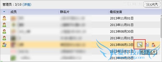 请打开群聊天对话框=》点击“群设置”=》“成员”=》点击要修改群名片的成员最右侧的修改按钮=》输入您要修改群名片信息。
