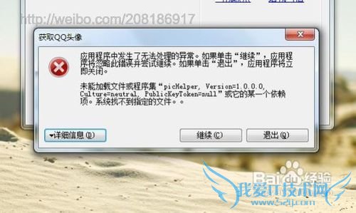接下来,在“腾讯QQ号”后输入想要获取的QQ用户的QQ号,然后点击“获取头像”按钮即可。PS:如果用户将picHelper.dll文件删除或移动到其他不与QQ_Face.exe所在文件夹相同的文件夹下,则当点击“获取头像”按钮时就会报错,如图所示。