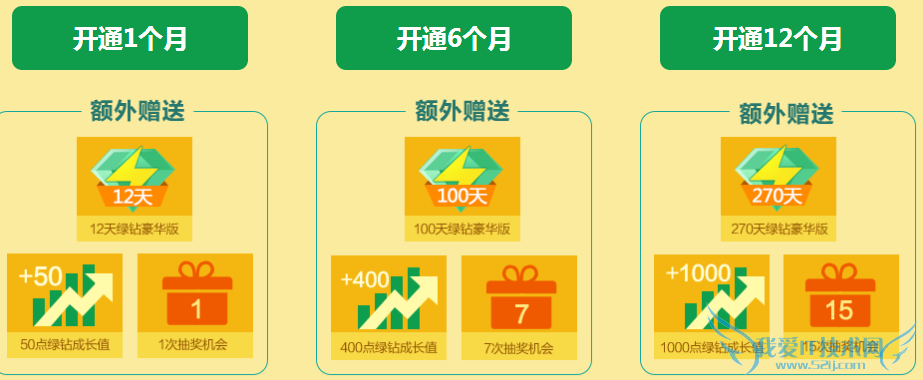 3、活动期间,开通1个月绿钻可额外获得12天绿钻豪华版、50点绿钻成长值及1次抽奖机会;一次性开通6个月绿钻可额外获得100天绿钻豪华版、400点绿钻成长值及7次抽奖机会;一次性开通12个月绿钻可额外获得270天绿钻豪华版、1000点绿钻成长值及15次抽奖机会。(以上绿钻豪华版均为升级包)
