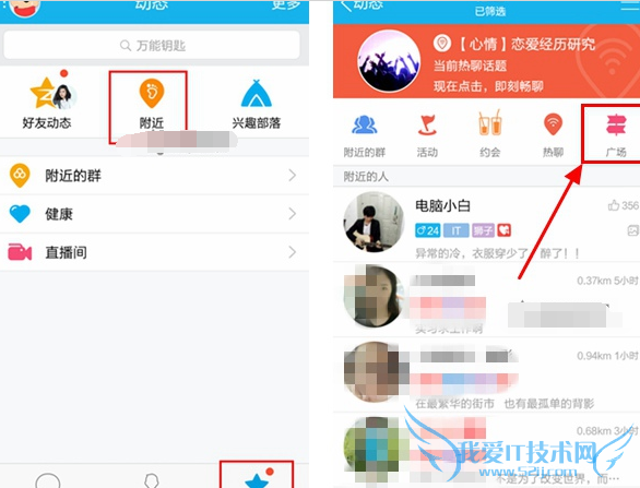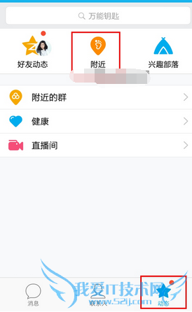 1、打开我们的手机QQ,切换到【动态】栏,点击【附近】图标,然后在其页面找到并点击的【广场】入口图标,如下图所示: