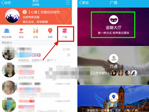 QQ语聊大厅只有手机QQ才有的功能,进入到动态附近便可找到,如下图所示: