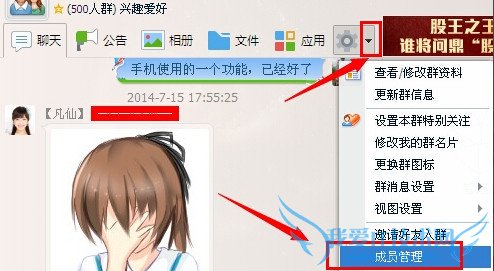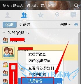 1、进入成员管理是在QQ主面板群列表那里,右击你的QQ群,会看到一个“成员管理”的选项,点击进入:(或者在群聊天窗口里,点击设置边上的倒三角,也会看到有个“成员管理”的选项,点击进入:)