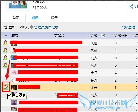 2、在群成员管理那里,鼠标移动到哪个不是管理员时,就会在最前面有个提示“设置管理员”,点击最前面那个图标即可: