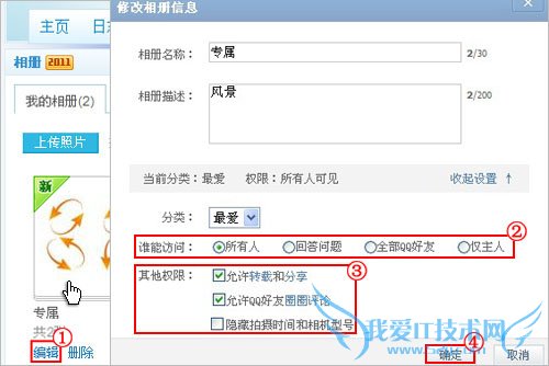 登录到您QQ空间的相册页面,鼠标放在某个相册上,点击左下方的“编辑”会弹出提示框,您可以在“谁能访问”和“其它权限”中进行选择,最后“确认”您的操作。