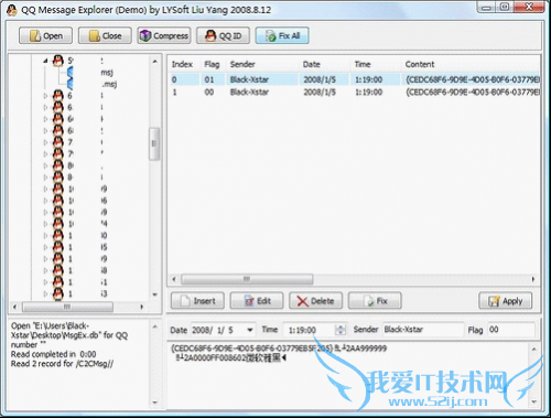 软件作者是中国人,可惜界面是英文的,不过还好比较简单。打开MsgEx.db文件后会要输入QQ号,千万不要输入错。