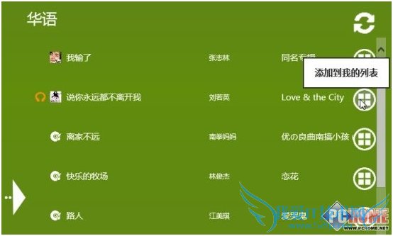 在歌曲列表右侧有一个类似Windows徽标的按钮,点击可以将制定歌曲添加至“我的列表”,这样就可以创建属于自己的播放列表了。顺便,注意屏幕中间的白色三角箭头,点击可以隐藏歌曲列表。