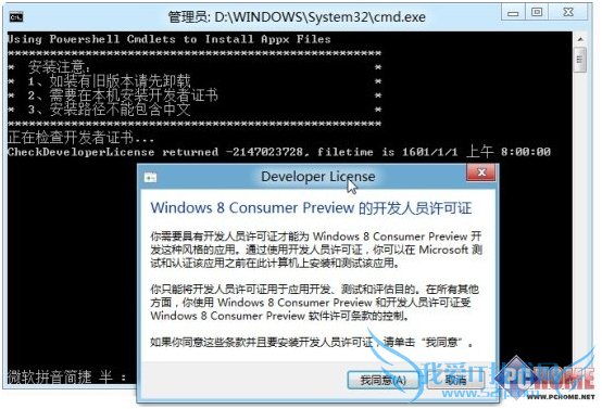 3、随后你会看到如下的安装过程和提示,点击开发人员许可证窗口的“我同意”进入下一步。