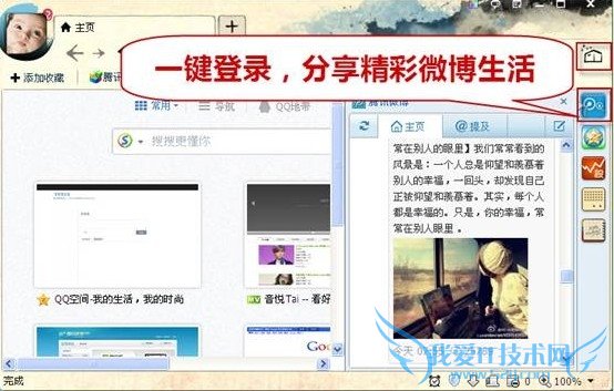 一连上班7天,这个周末可要安心呆在家里好好放松一下了,上上网发发微博来度过假日时光,不失为一个好的选择。用QQ浏览器网上冲浪,在网上遇到趣闻趣事随时通过腾讯微博分享给好友。QQ浏览器侧边栏方便用户快捷登录腾讯微博,让用户能一键与好友分享自己遇到的趣闻趣事,满足“微博控”们分享的欲望。(图3)