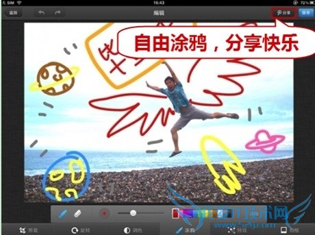一个真正的微博控即使在路上也不忘分享,在外游玩遇到趣闻趣事用QQ影像HD来个搞怪的涂鸦分享到腾讯微博,让一众好友也能体会到此时你的快乐。