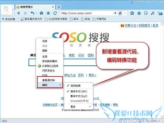 对于专业人群来说,需要查看网页html文件的源代码,只需在网页的空白处单击右键选择“查看源代码“,QQ浏览器即启动一个新的页面来显示相应网页的html文件;如果是要切换页面编码显示,同样可利用右键菜单实现编码切换。(图3)