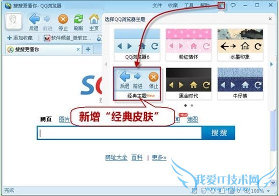 QQ浏览器对产品本身的功能设计精益求精,不断升级产品基础功能,同时,对外观的优化也在不断更新中。QQ浏览器6.6正式版此次新增“经典皮肤”,对于习惯经典浏览器界面的用户来说,这个更新可算是一个惊喜。点击窗口右上角“换肤”按钮,选择“经典皮肤”即可十分方便快捷的切换到经典界面。(图2)