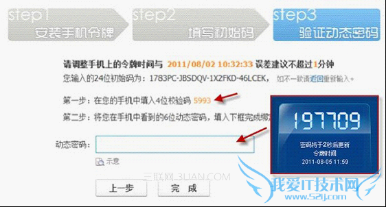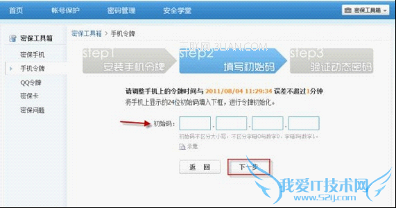 输入QQ安全中心(手机令牌)上提示的24位初始码到网页提示位置,并点击【下一步】。输入网页返回的4位校验码到手机,并点击【校准时间】。