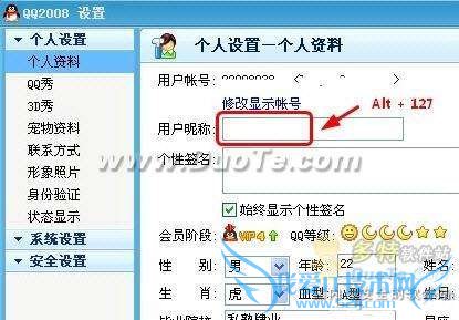 首先是头像,将QQ头像设置为“空白”的方式比较简单,随便找一张白色图片,更换为当前的QQ头像即可(注意:16级以下用户无法上传自定义头像)。其次是将网名进行“伪装”。用户点击进入软件“个人设置”界面,将鼠标移至用户昵称框中,此时按住键盘alt键,选择数字键中的1、2、7键,松开手后,名称便会成为空白(如图2)。