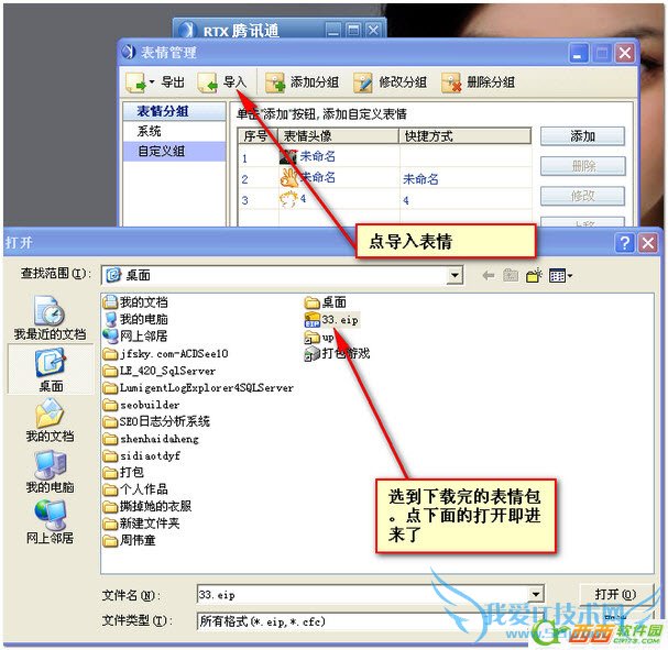 rtx表情包的导入就在自定义表情那里点导入就可以了。但是得下载到eip格式的表情包。(如下图)