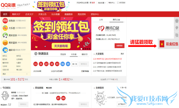 1. QQ彩票百万红包等你领取,每日登录即可从活动区域领取一枚彩金红包,先到先得送完为止;