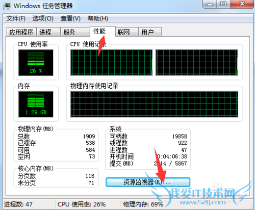 2、进入任务管理器界面,在上方菜单栏中找到性能选项,然后在性能对话框右下角找到资源监视器打开。