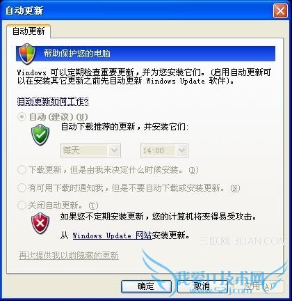 以Windows XP操作系统为例,您可以打开“开始”菜单,单击“控制面板”,在新开启的窗口中依次打开“Windows安全中心”和“自动更新”查看当前计算机的自动更新设置。